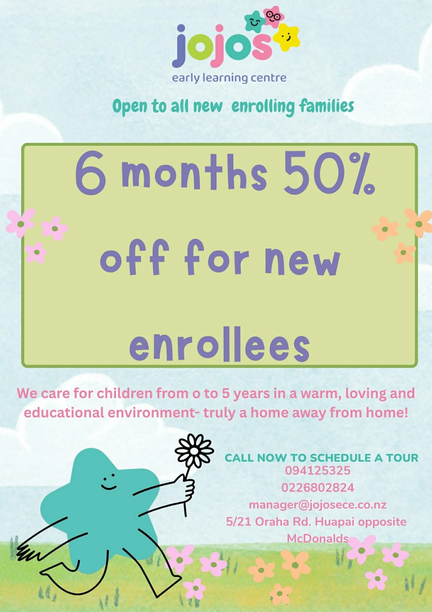 Jojo’s Early learning centre is a locally and privately owned/operated Early Learning Centre that services a wide area of North-west Auckland. Licensed for up to 100 children from birth – 6yrs.